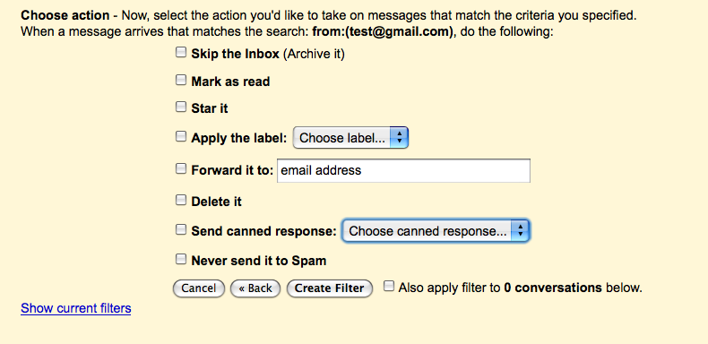 Com os filtros podemos seleccionar inúmeros critérios para escolha de emails, como por exemplo: email enviados por determinada pessoa, que contenha um texto específico no assunto ou corpo do email, etc. Depois, uma das opções disponíveis é responder automaticamente a esse(s) emails usando uma das vossas respostas pré-gravadas.