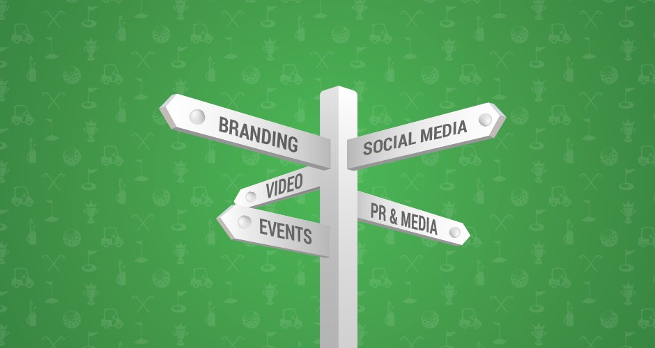Services we do: Consulting & Strategy, PR & Media, Branding, Sales & Management, Web & Social Media, Video, Golf Product Marketing, Content & Creative, Events.