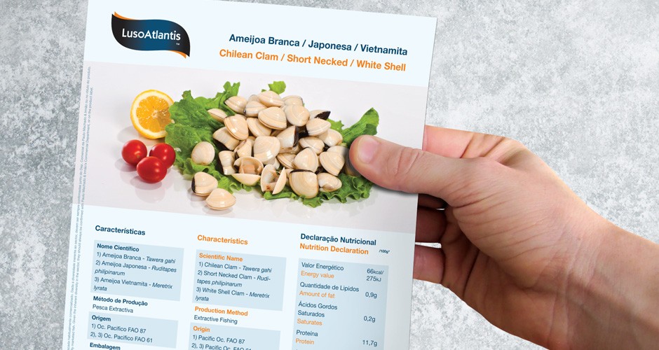 As monofolhas técnicas de produto são um elemento essencial de comunicação empresarial uma vez que permitem dar a conhecer mais informação sobre a grande variedade de produtos existentes na Lusoatlantis. Desenvolvidas a pensar quer na vertente de negócios mais tradicional quer numa forma mais actual e dinâmica de estabelecer contacto com as empresas, foram desenvolvidas monofolhas de produtos com informação técnica de produtos e dados detalhados sobre tipo de apresentação disponível, origem e método de produção, opções de embalamento e informação nutricional do produto. |